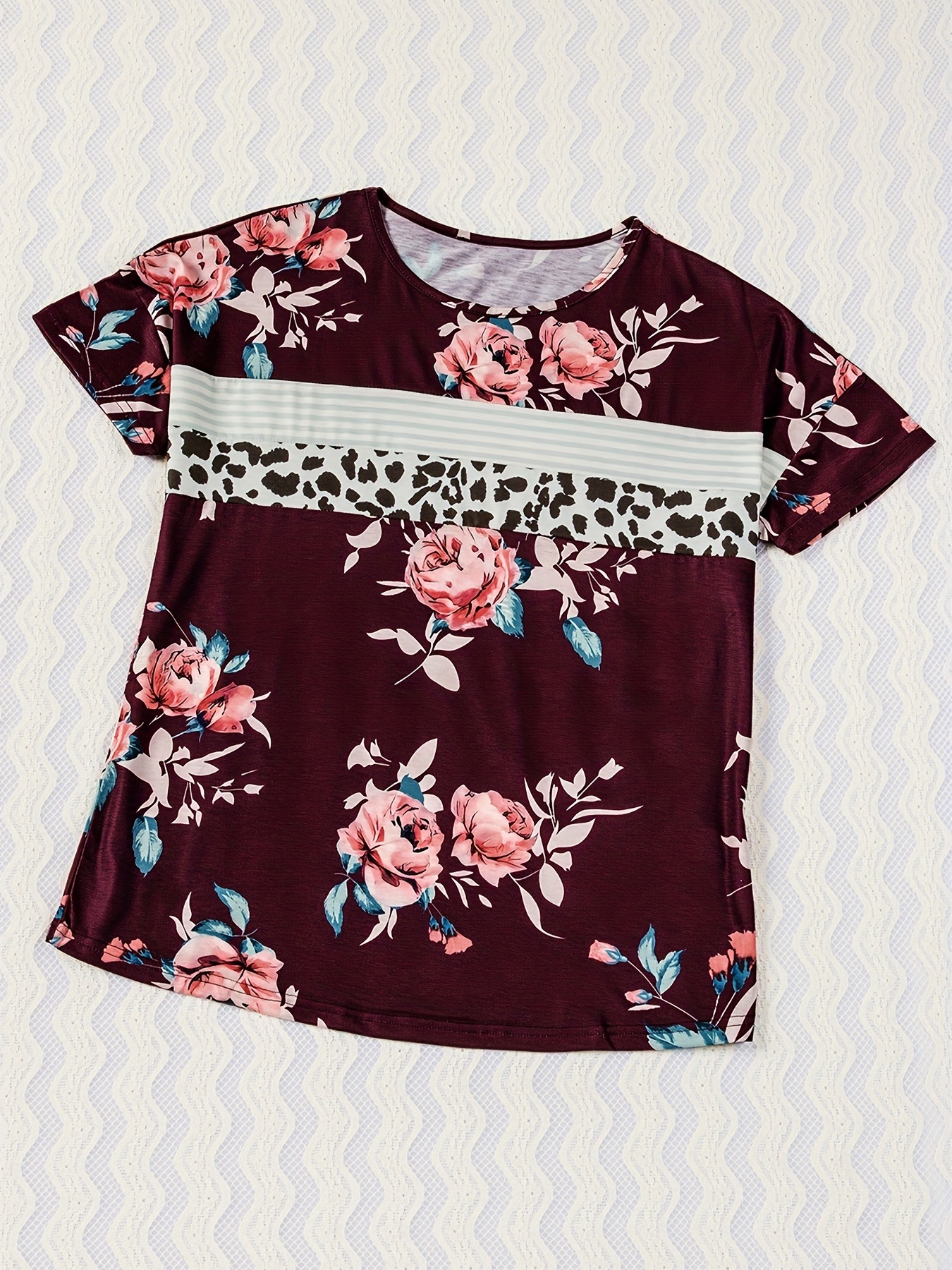 Striped & Leopard Print T-Shirt; Casual Crew Neck Short Sleeve T-Shirt For Spring & Summer, Comes in red only, small, medium, and large.